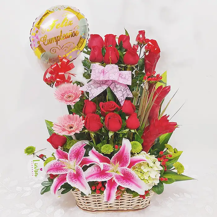 CM- canasta rosas, gerberas más globo feliz cumpleaños